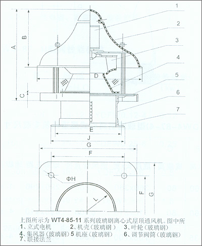 WT4-85-11型玻璃鋼離心式屋頂風(fēng)機外形結(jié)構(gòu)圖及安裝尺寸單位:㎜